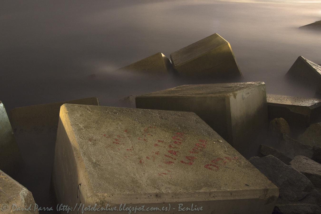 Hay numerosas formas de entrarle a l mar… En este caso desde los espigones de las playas de Barcelona. Con el mar en calma, prácticamente sin luna, con nubes bajas y el reflejo de la luz contaminante de la ciudad.