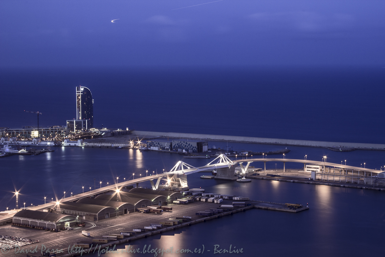 Fotografía del puente basculante que une los muelles de Poniente y Adosado en el puerto de Barcelona. Tomada desde los alrededores del castillo de Montjuïc. Lugar de acceso a cruceros y grandes navíos. Al fondo el moderno hotel Wella.