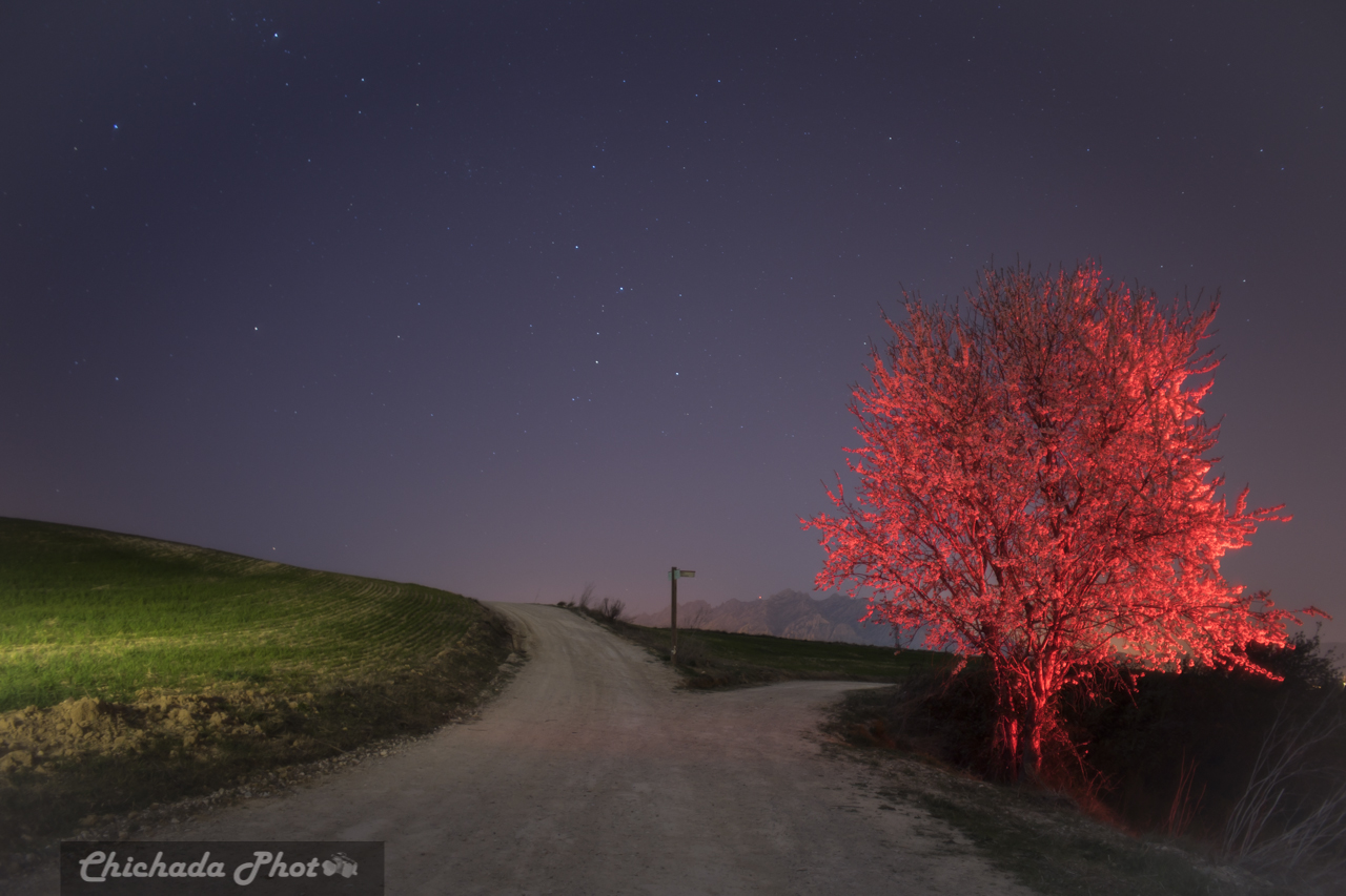 La primera parada un almendro a la derecha de un cruce de caminos. Saqué el equipo y comiencé a encuadrar. Lástima de estar rodeado de pueblos y contaminación lumínica porque la montaña de Montserrat podía dar mucho juego. Con una luna del 64% tenía claro que muchas estrellas no podía conseguir, después de las mediciones oportunas al cielo para la iluminación divido la faena y una persona le tocaba iluminar con la linterna Ultrafire 501B cálida el campo de la izquierda,la otra con la linterna Ultrafire 501B fría el almendro desde izquierda y derecha y como viene siendo mi toque personal un poco de linterna Ultrafire 501B roja para iluminar el cartel del cruce de caminos.
