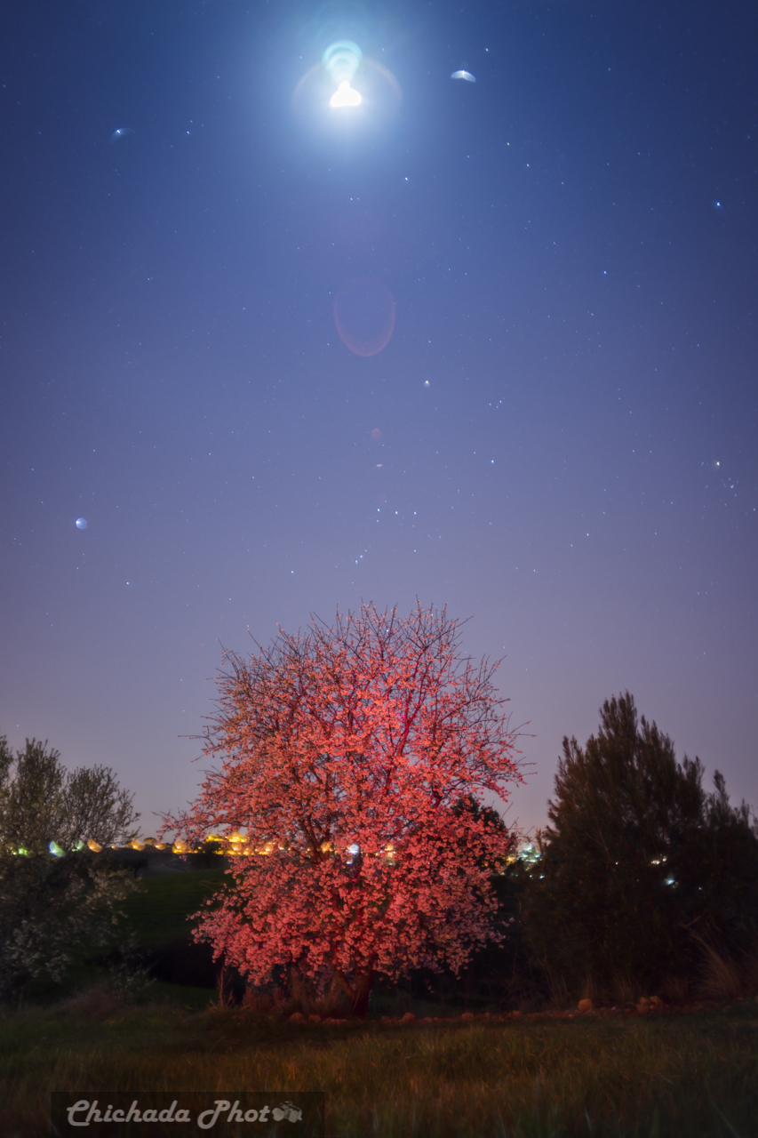 Una vez comprobado que no podía sacarle más partido al almendro continúe por el camino 10 minutos, a la derecha vimos un par mas de almendros pero tapados de vegetación o con las luces del pueblo en el encuadre. Como habéis podido comprobar he cambiado de equipo y estoy probando alguna lente antigua. esta lente responde muy mal con luces, y para muestra un botón. Título “Amond-tree abduction”