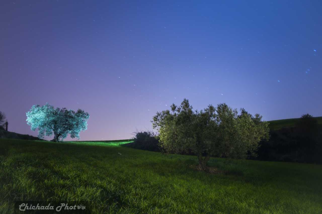 Para iluminar la toma quise hacer un contraste entre los dos olivos ,use la linterna Ultrafire 501B cálida para el olivo más cercano y el césped. Para el olivo más lejano usé la linterna Ultrafire 501B fría dándole algunos toques a un lateral desde detrás de unos matorrales y escondido por el tronco para crear alguna sombra.